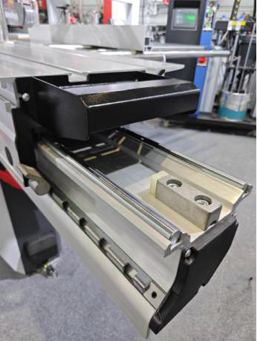 Роликовая каретка шириной 430 мм, усиленная дополнительным стальным стержнем с цилиндрическими направляющими действует по принципу «вагонной тележки», обеспечивая, помимо, точности и качества распила, долговечность работы.