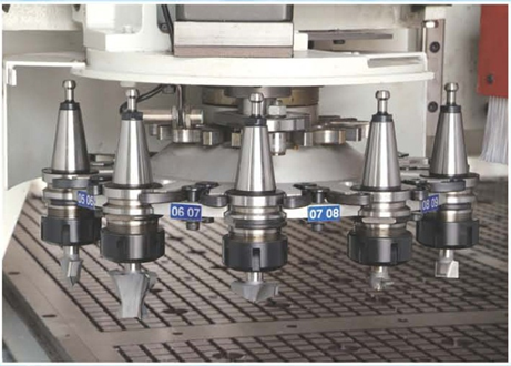 Система автоматической смены инструмента с тарельчатым магазином на 12 патронов ISO 30 (12 шт. поставляются в комплекте). Размещение магазина на портале позволило в разы сократить время цикла замены инструмента, так как станок теперь меняет инструмент с минимальными переходами в зоне обработки и тем самым повышает свою производительность. Максимальный диаметр хвостовика инструмента под цангу ER32 до 20 мм. |