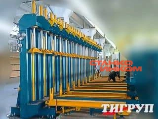 Линия склеивания бруса ( брус 24 м ) с механизацией подачи ламелей в пресс, выгрузкой из пресса и подачей в строгальный станок. Параллельно установлены два пресса