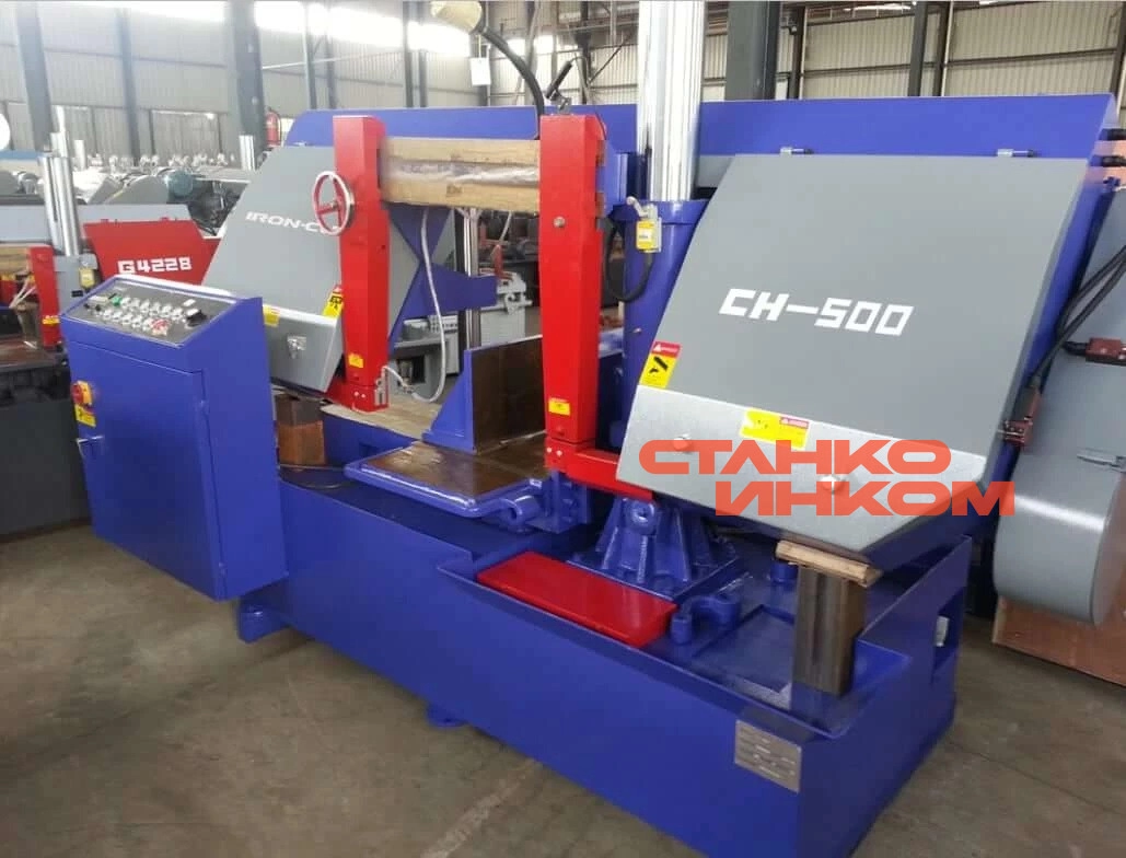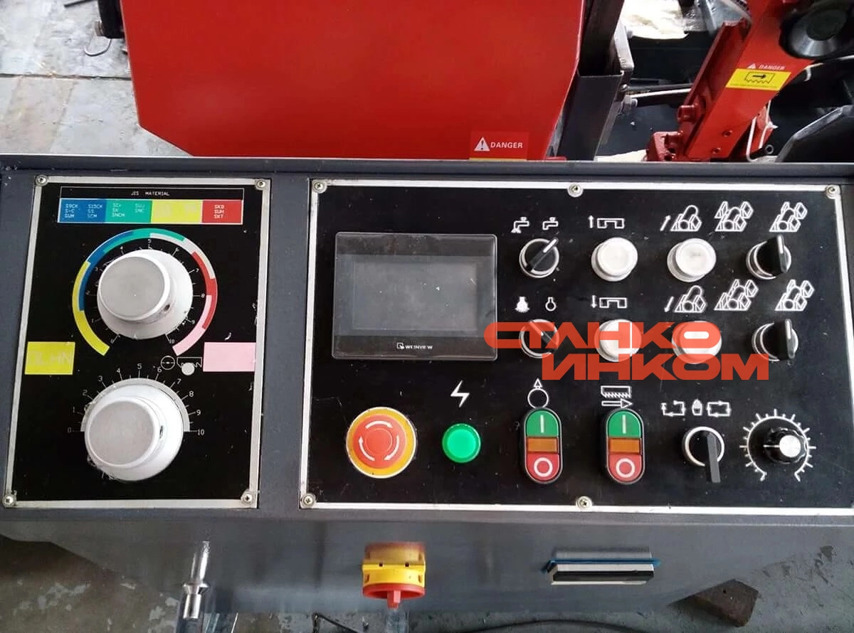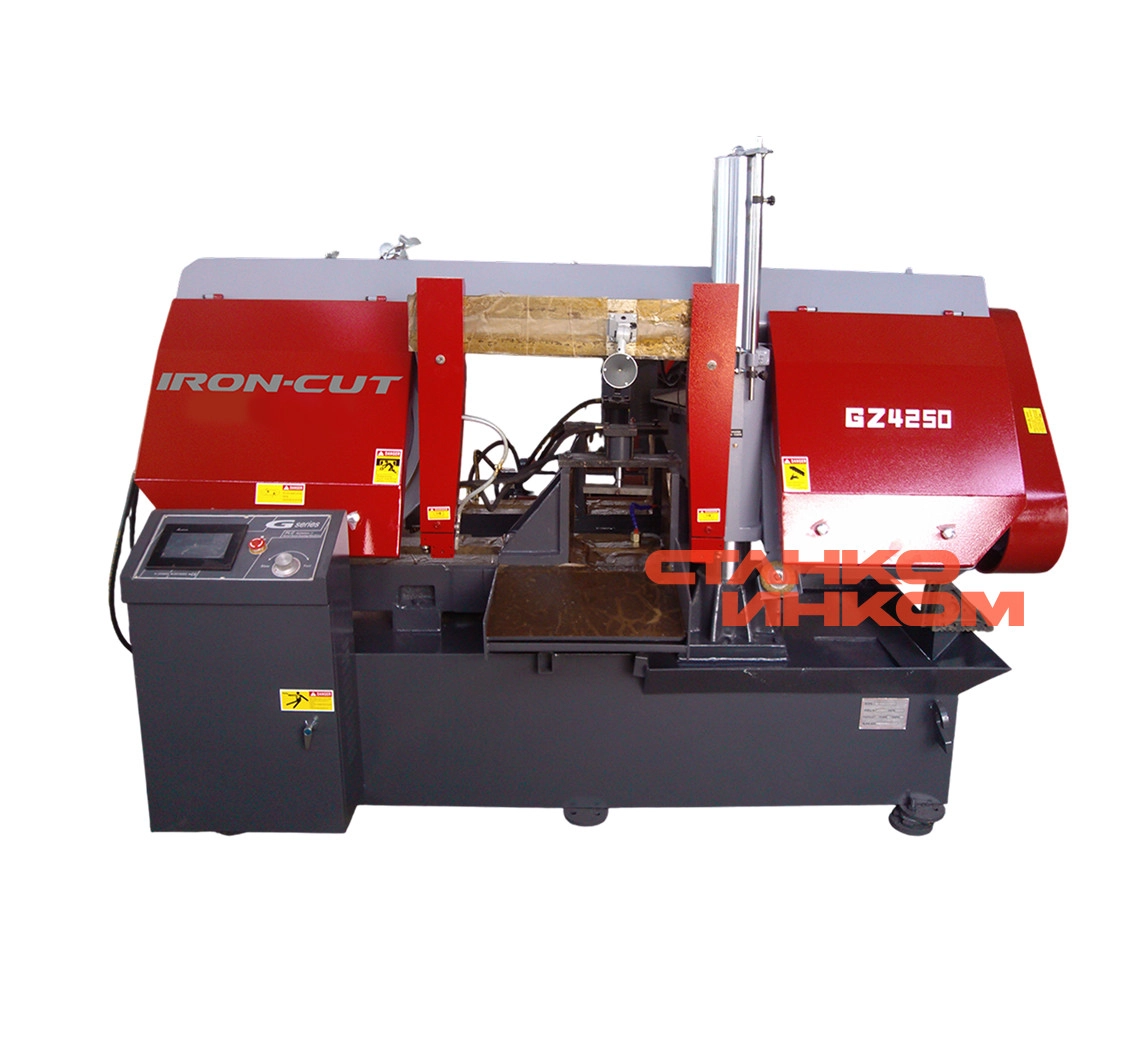 Зажим заготовки осуществляется гидравликой, что обеспечивает быструю и надежную фиксацию заготовки. Натяжение полотна осуществляется механически (динамометрическое устройство) и обеспечивает оптимальную натяжку по параметрам, рекомендованных мировыми производителями ленточных полотен (300 Н/мм2). Жесткая конструкция, плавная регулировка подачи пильной рамы (гидравлика) и параметр скоростей пилы (пять скоростей) позволяют подобрать оптимальный режим резания, как для конструкционных сталей, так и нержавеющих, жаропрочных, инструментальных и подшипниковых сталей.