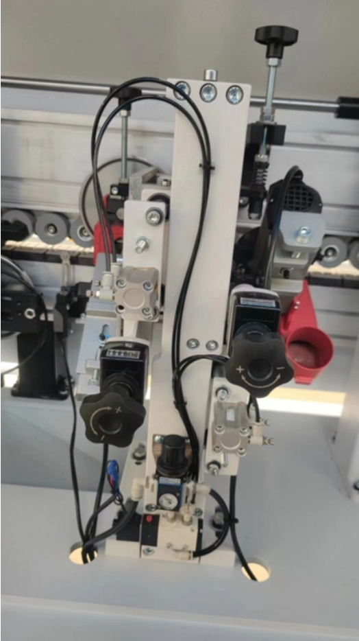 Предварительный нагрев торца заготовки создает нужную основу для качественной приклейки кромки. Рабочая температура Инфракрасной лампы около 300 С. Особо актуальна в зимний период времени. С помощью цифрового счетчика регулируется ход прижима на толщину кромочного материала. Усилие пресс группы задается пневматически, что позволяет качественно приклеить кромочный материал к детали. Если регулировка пресс группы осуществляется механически с помощью пружины, то одного усилия на пресс валах добиться не удастся, что приводит к частичному отклеиванию кромки.