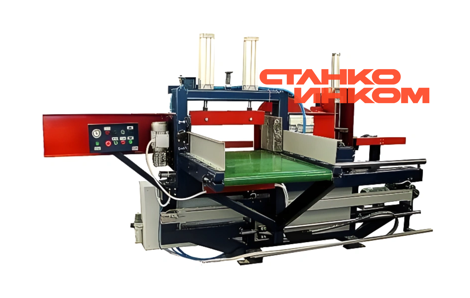 Станок оснащен автоматическим подъемным клеенаносящим барабаном, регулятором скорости подачи каретки, датчиком недостаточного давления в пнемосистеме, поворотным суппортом поджатия последней заготовки в пакете.