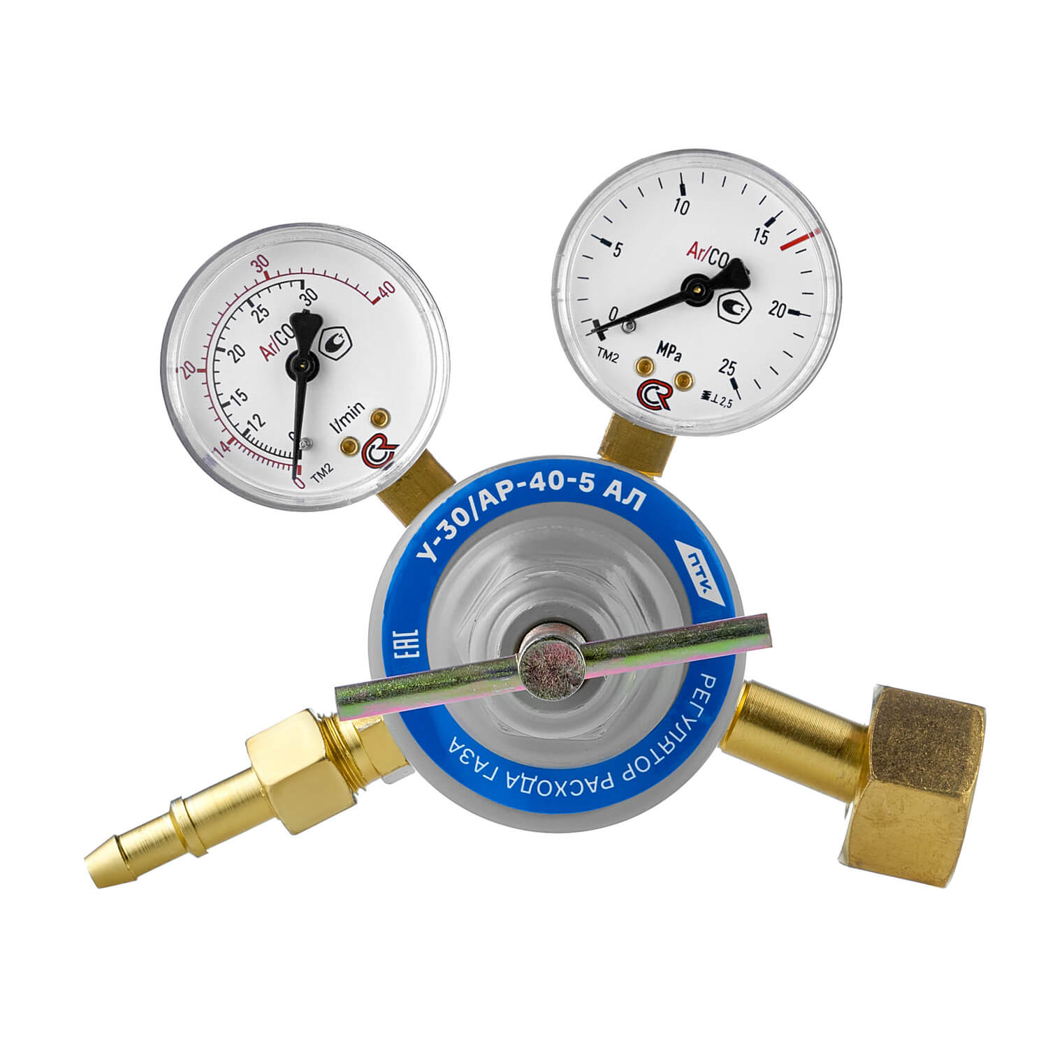 Регулятор расхода газа ПТК У-30/АР-40-5 АЛ (001.010.609) с манометрами для углекислоты и аргона предназначен для понижения давления газа и автоматического поддержания постоянным заданного расхода при питании постов и установок в среде защитных газов.