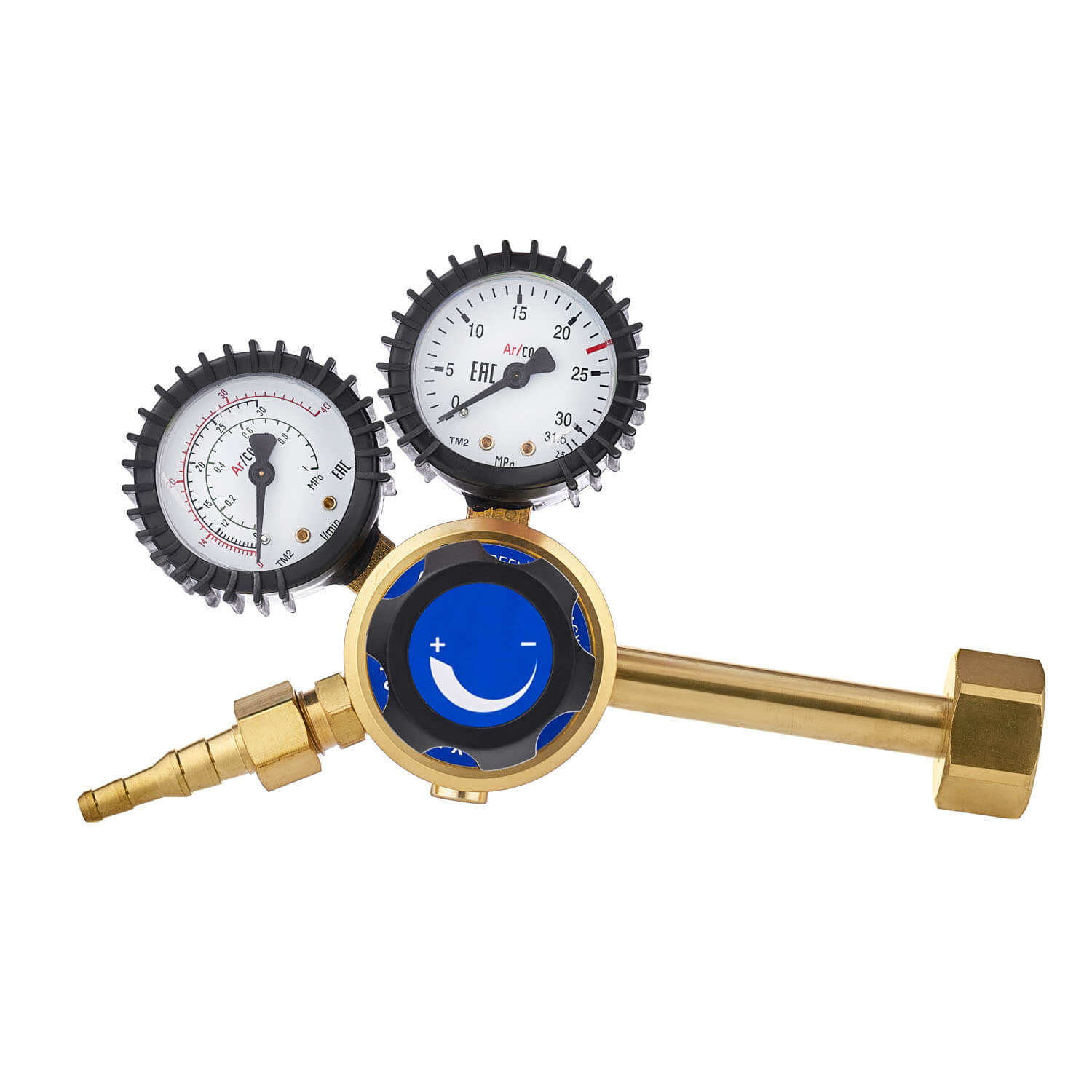 Оснащен манометром высокого давления, который отображает показания давления в баллоне, и манометром-расходомером для настройки расхода углекислого газа или аргона.