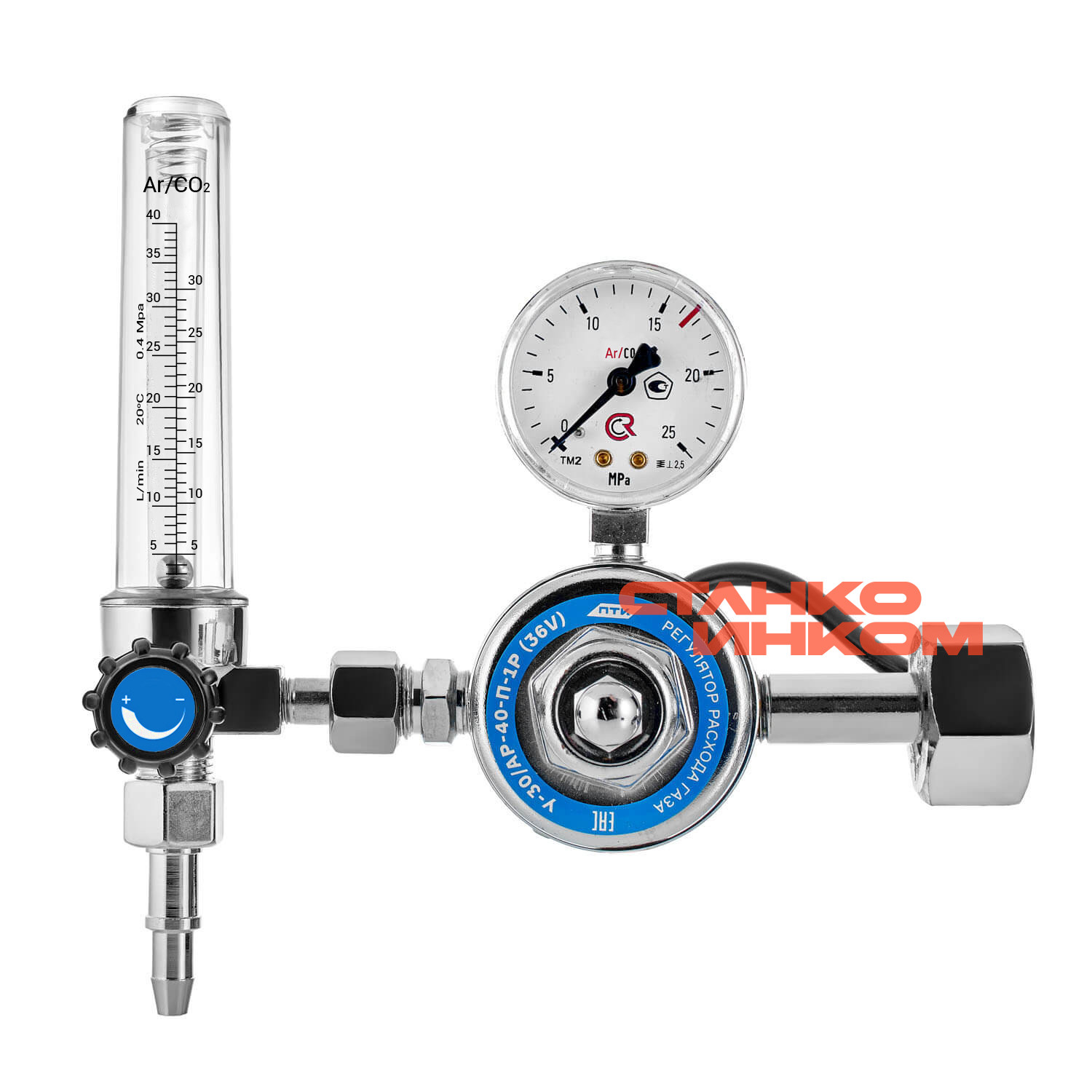 В корпус регулятора встроен подогреватель на 36В. Электроподогреватель обеспечивает работоспособность регулятора при низких температурах окружающей среды (до -30°С). Корпус регулятора изготовлен из латуни, никелированное покрытие. Колба ротаметра изготовлена из прочного пластика, которая имеет две шкалы Ar/CO2.