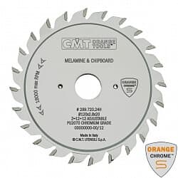 Пазовые регулируемые пилы CMT выпускаются в двух сериях – стандартное качество и высокое качество (улучшенное). Пазовые подрезные пильные диски CMT высокого качества имею артикул серии 289.7xx.xx и отличаются от стандартных подрезок жестким корпусом, зубьями из тв. сплава с содержанием хрома, специальным хромовым покрытием корпуса, предотвращающим налипание грязи на пилу, и более строгими допус на биение.