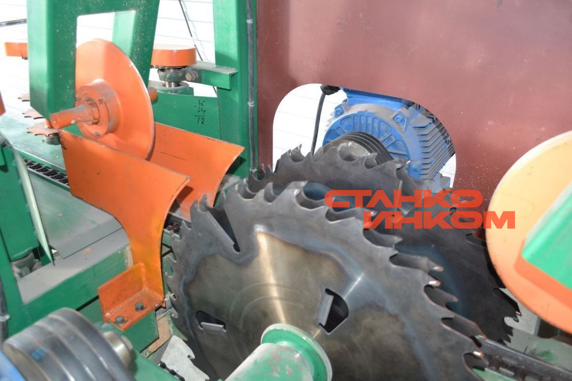 Обладает высокой производительностью за счет симметричной резки заготовок с двух сторон за один проход. Размер между пилами устанавливается вращением рукоятки со стороны оператора. Пилы расходятся и сходятся симметрично относительно продольной оси станка.