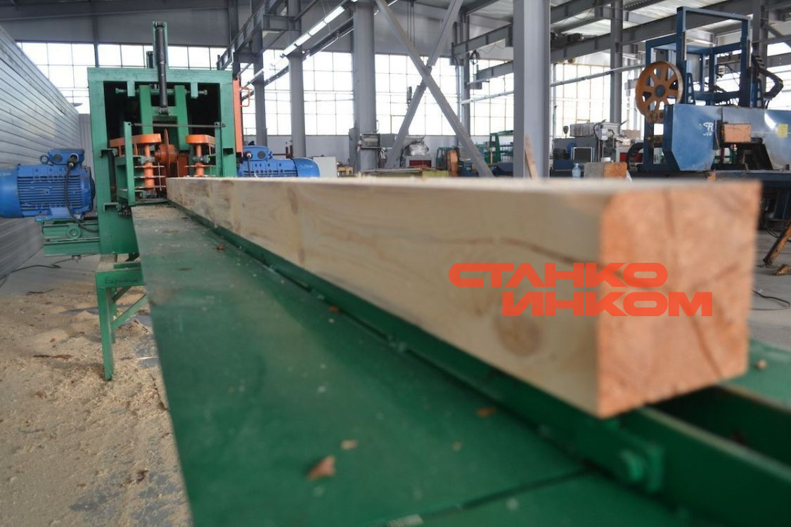 Бревно укладывается по центру стола и обрезается сразу с двух сторон при подаче в пильный блок. Прижим заготовки обеспечивается прижимными дисками по центру - перед заходом в пильный блок и при выходе из него.