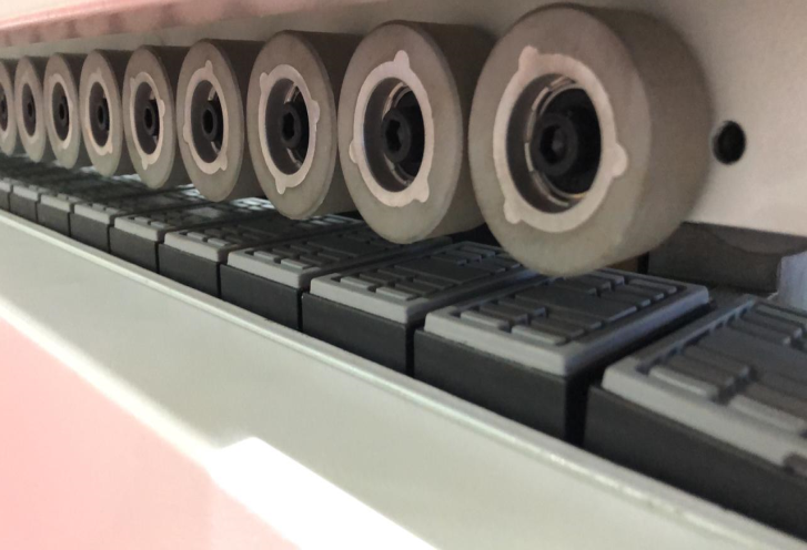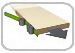 Долговечная и надежная конструкция. Точное перемещение башмаков за счет полукруглой направляющей прошедшей специальную термообработку с помощью цепи. Износостойкие башмаки в сочетании с резиновыми прижимными роликами, расположенными в два ряда, обеспечивают точную транспортировку заготовок.