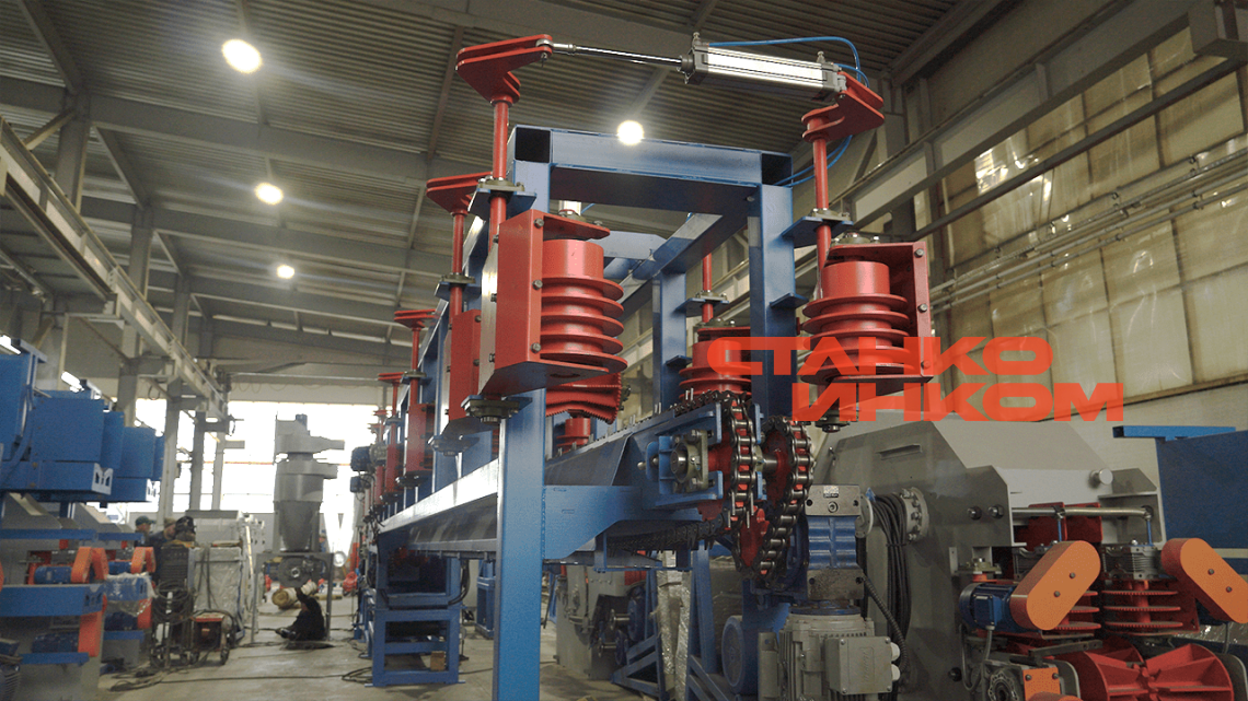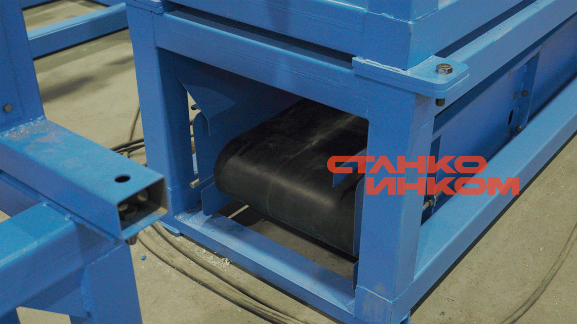 Подача сырья в пильный блок, осуществляется с помощью гусеничной транспортной системы. Фиксация бревна происходит с помощью автоматических пневмо-прижимов.