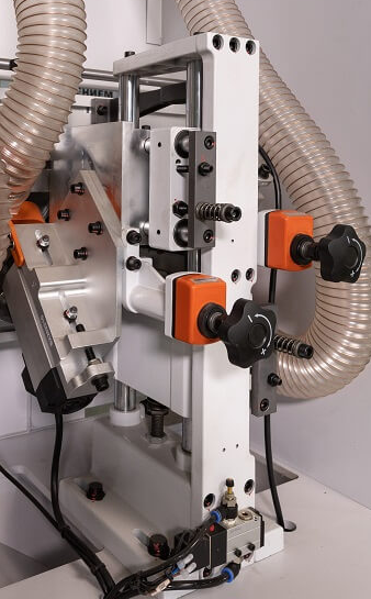 Узел прифуговки. Предназначен для устранения дефектов раскроя (микро-сколов, ступеньки от подрезной пилы), гарантирует перпендикулярную и прямолинейную геометрию поверхности торца детали. Две фрезы с алмазными ножами Ø120 мм H50 мм Ø40 мм Z3+3 Два двигателя противоположного вращение с автоматическим подводом/отводом в зону обработки убавляются с помощью пневмоцилиндра. Регулировка по высоте, позволяет максимально использовать весь ресурс инструмента. Полностью закрыт пылезащитным кожухом.