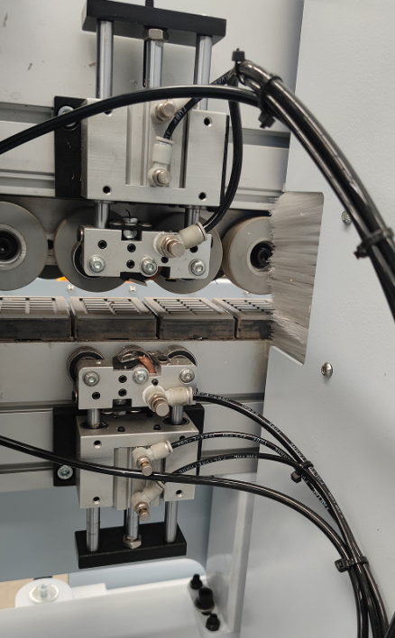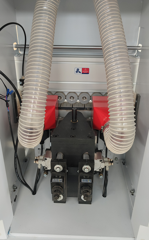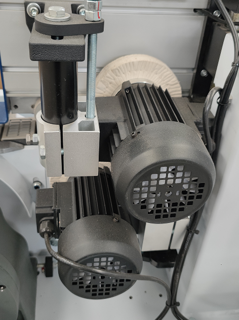 Узел прифуговки. Предназначен для устранения дефектов раскроя (микро-сколов, ступеньки от подрезной пилы), гарантирует перпендикулярную и прямолинейную геометрию поверхности торца детали. Две фрезы с алмазными ножами Ø120 мм H50 мм Ø40 мм Z3+3 Два двигателя противоположного вращение с автоматическим подводом/отводом в зону обработки убавляются с помощью пневмоцилиндра. Регулировка по высоте, позволяет максимально использовать весь ресурс инструмента. Полностью закрыт пылезащитным кожухом.