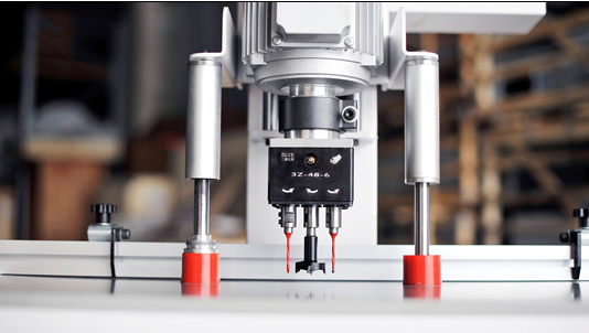 3-х шпиндельная головка 48 х 6 имеет три патрона. Один патрон для чашечного сверла для выборки отверстия под петлю и два- для сверл под крепление петли. Отверстия для крепления петли соответствуют отверстию под петлю и рассверливаются одновременно с операцией фрезерования. Возможна установка фрезы для выборки петли различного размера. Механические прижимы надежно фиксируют заготовку на столе.