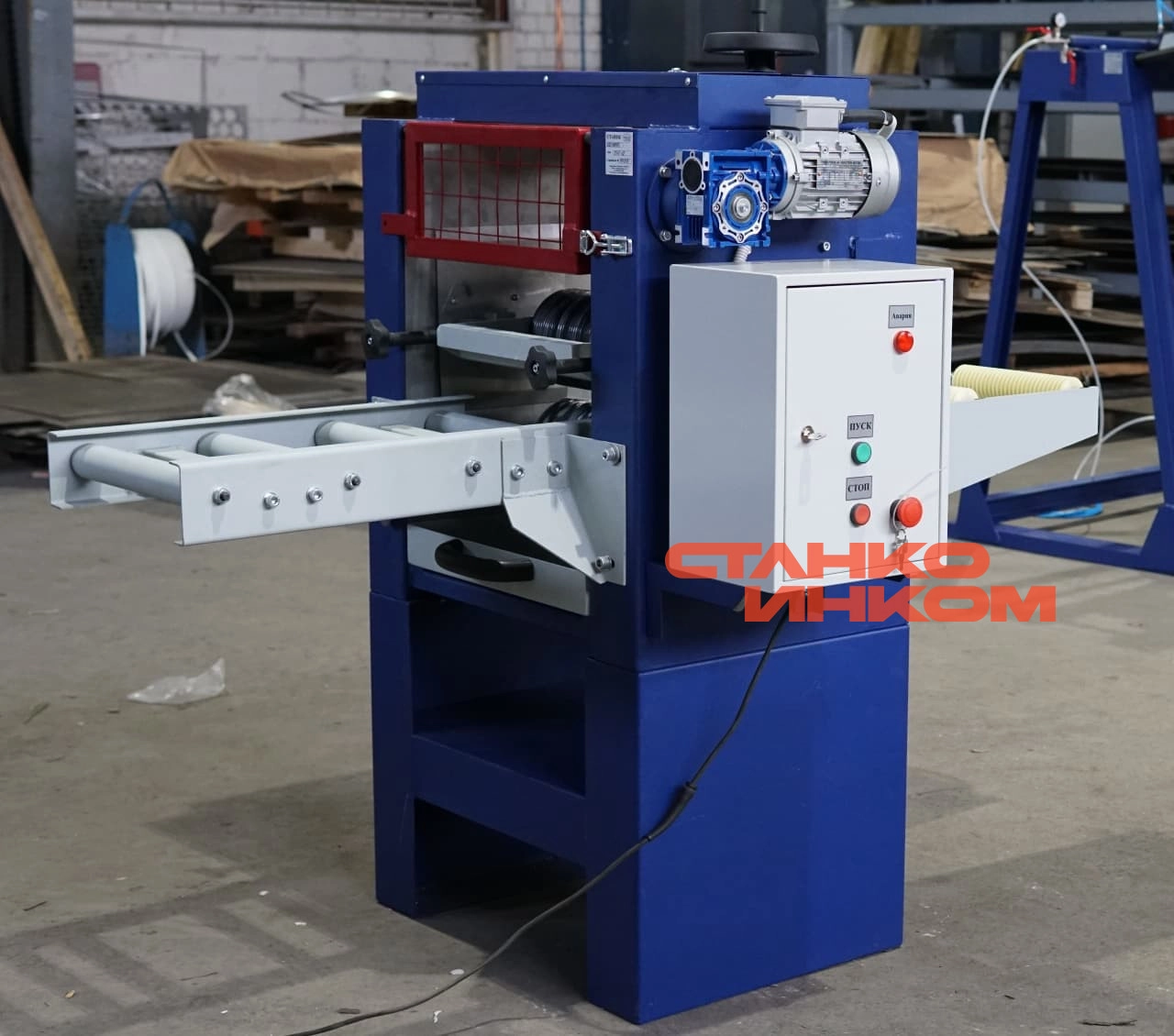 2. Рольганг для приема обработанных заготовок имеет валы, изготовленные из высокопрочного материала, не реагирующего на клеевой состав, которым покрываются пласти заготовок. На поверхности валиков имеются насечки, предотвращающие накопление лишнего клея на поверхности станка путем удаления их в специальный поддон для сбора клея.